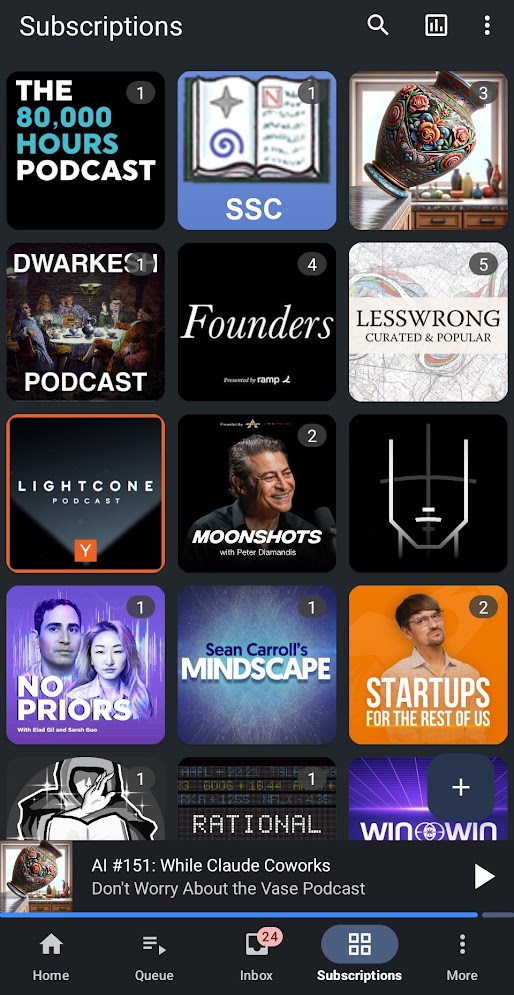 For recent events specifically, Don’t Worry About the Vase is an excellent blog. Zvi, the prolific author of said blog, posts weekly AI roundups and provides early reactions to notable events within a day or so. It recently occurred to me that Don’t Worry About the Vase is the closest thing I consume to a classical news channel. I like how Zvi incorporates quotes and back-and-forths from various sources, often with his perspective or response included. While this blog focuses on AI, other topics range from education to dating, and from movies to policy. There is an excellent audio version.